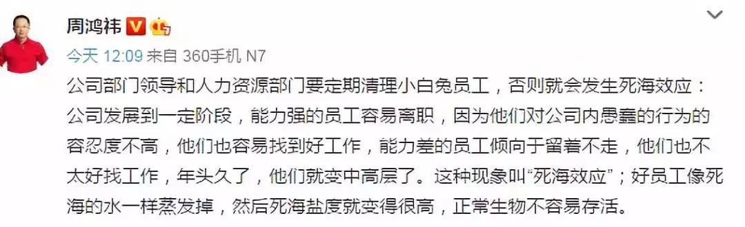 近日,周鸿祎发微博称,要求人力资源部门要定期清理『小白兔员工』,否则就会发生『死海效应』。
