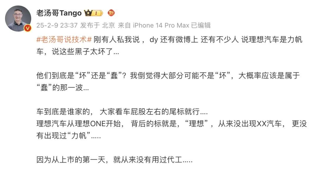 理想汽车产品线的负责人汤靖很快就出来辟谣了,他说得可干脆了,就一句话:“想知道车是谁家的,看车尾标志就完事儿!”从理想ONE开始,所有理想汽车车尾标的都是“理想”,压根儿就没有“力帆”俩字。汤靖还特意强调:“理想从上市第一天起,就从来没找别的工厂代工过!”