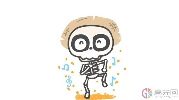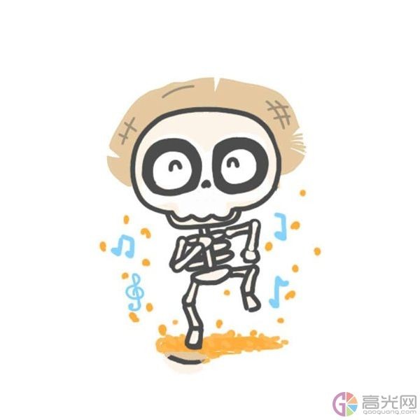 首先我们画出骷髅人的骷髅头,然后画出他的五官,接着画出他上半身的肋骨和手,之后画出他的腿,最后给骷髅人画一个帽子和一些彩色的音符,这样这个骷髅人简笔画就完成啦!