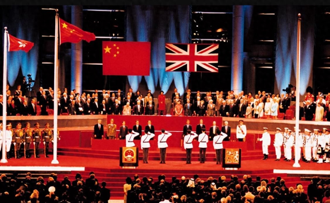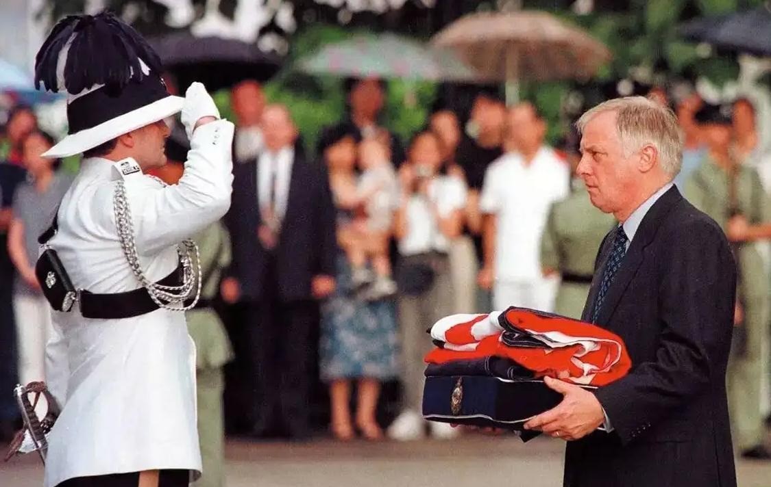 1997年6月30日晚至7月1日凌晨,在庄严的仪式上,彭定康亲手将英国国旗交还,标志着英国对香港殖民统治的正式结束。他神色落寞,黯然离场,三个女儿更是哭成泪人。