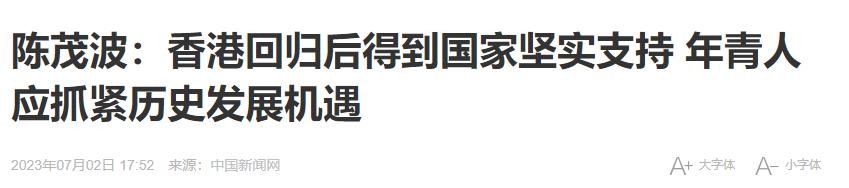 信息来源:《陈茂波:香港回归后得到国家坚实支持 年青人应抓紧历史发展机遇》,中国新闻网,2023年7月2日。