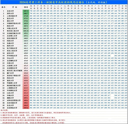 2024年内地高校在全国30省市理工科本科一批次的录取分数线已经发布,北京大学和清华大学分别以687.3和686.7分的均分牢牢占据着前两位。同时,上海交通大学、复旦大学和浙江大学的录取分数线均分也超过了670分,排在全国的第3-5名。