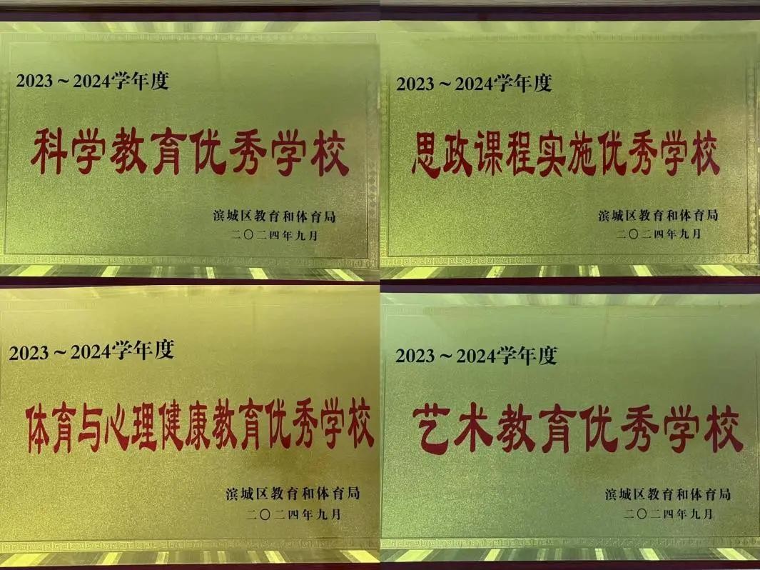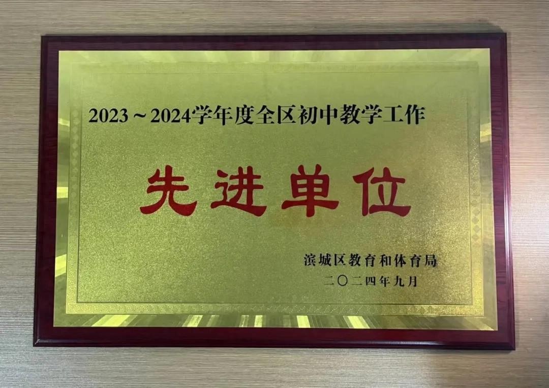 2024年9月26日,在滨城区中小学教学工作会议中,我校获得“2023-2024学年度全区初中教学工作先进单位”等五项殊荣。