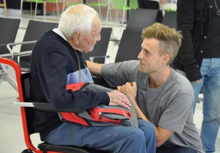 古德尔坐在轮椅上跟自己的家人告别,他面带微笑地看着很是乐观。