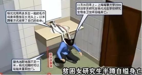 杨元元被发现的时候还有最后一口气,紧急送医之后,还是没能抢救过来。她的自缢方式让人震撼,两条毛巾打个结,挂在了洗手池的水龙头上。洗手池距离地板还不到一米,她整个人都是半蹲着上吊的。