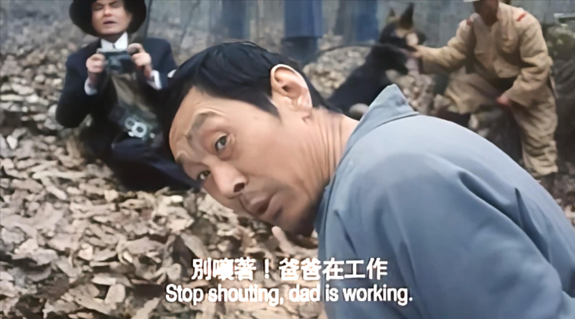 为了向日本军官谄媚,翻译为了配合记者拍照摆出被斩首的造型,还不忘告诉儿子自己在工作。