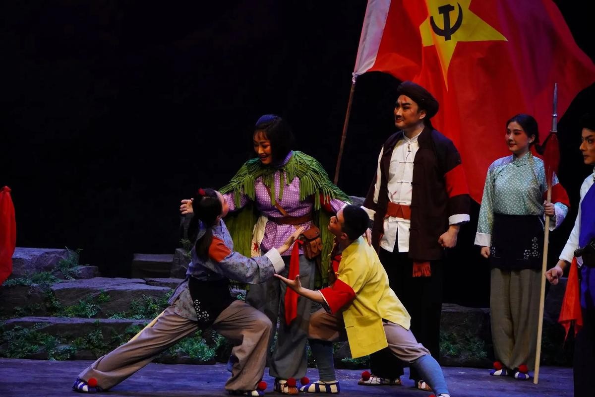 《长夜待晓》作为全剧之首,犹如一幅波澜壮阔的历史画卷,分为暗转前后的两个大段落,将观众缓缓带入那个风云变幻的年代。暗转前,舞台布景呈现出“山深崖险,夜色深重”的苍茫景象,宛如大革命失败后斗争环境的险恶写照,每一处细节都透露着危机四伏。犬吠、枪声、人声交织在一起,伴随着毒蛇胆鸣枪追捕的戏剧动作,白色恐怖的浓重氛围扑面而来,让人窒息。然而,在这看似绝望的黑暗中,却孕育着不屈的生命之火。雷刚攀藤越涧,冲破敌人的重重包围,他的身影在夜色中显得格外矫健,形象地展示了革命人民英勇不屈、顽强反抗的战斗精神。