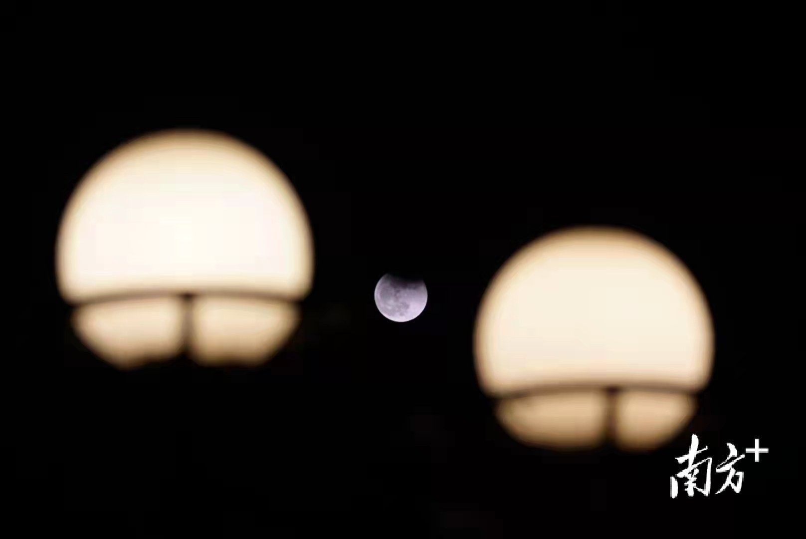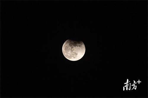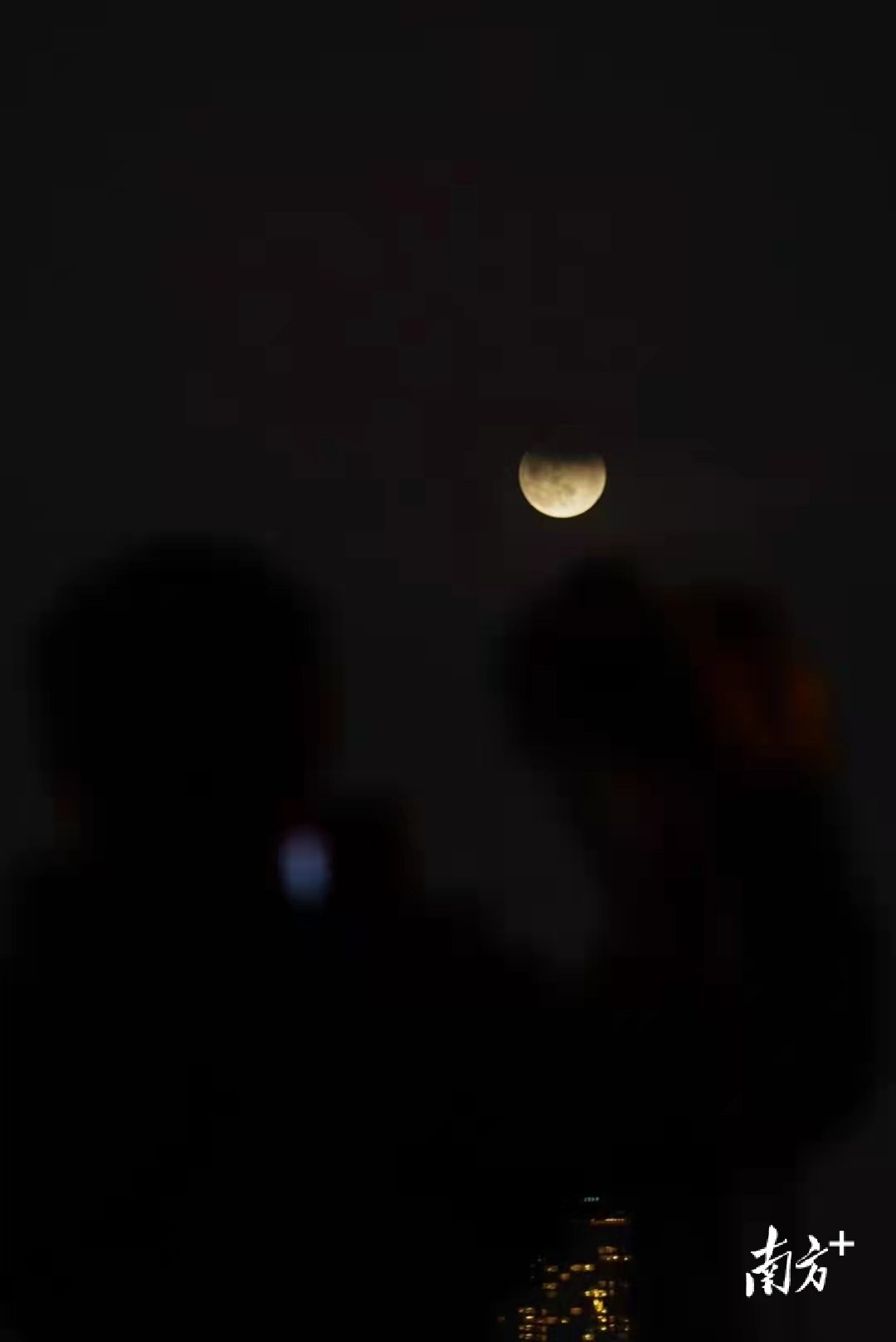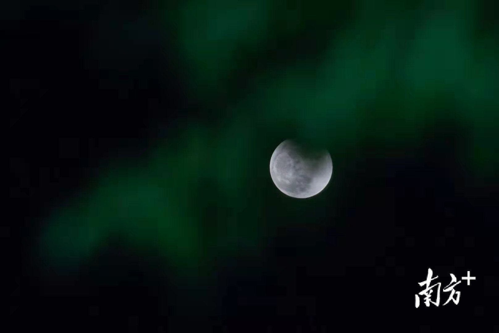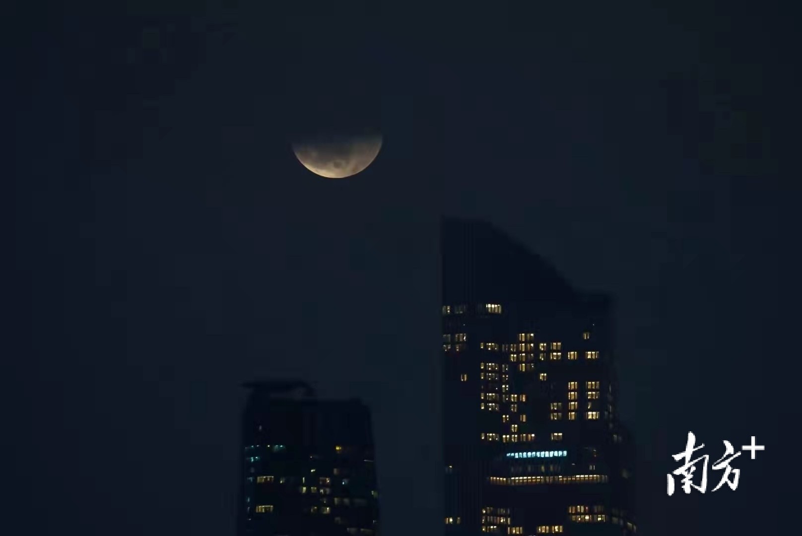 11月19日晚6时许,广州上空出现月偏食的天文景象。在天气晴朗的条件下,本次月偏食,在我国绝大部份地区皆可观赏。由于广州今日多云偏阴,月偏食在“食甚-复圆”的环节方可在市区观测到。本次月偏食在北京时间15时18分迎来初亏,17时03分迎来食甚,18时47分迎来复圆,过程历时3小时29分。本次月食也是今年最后一次月食。