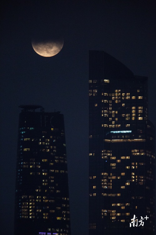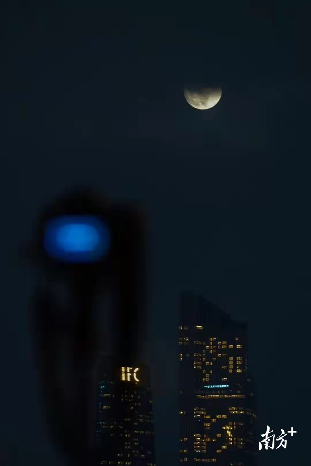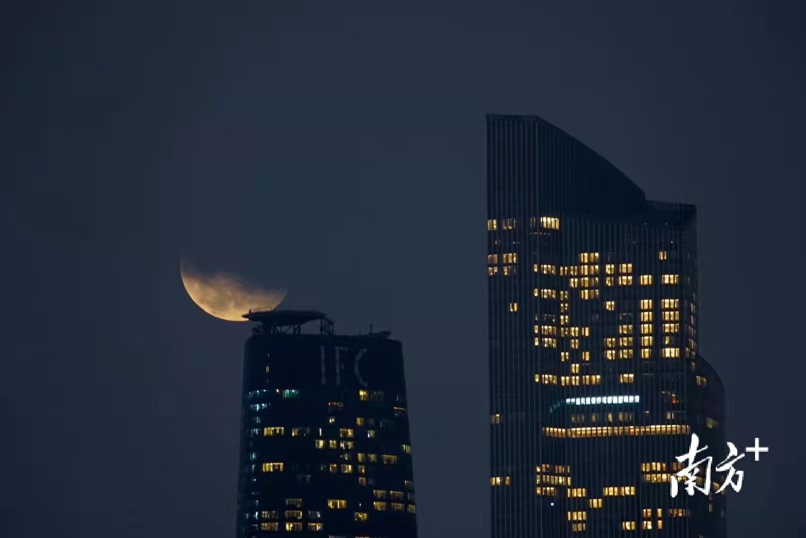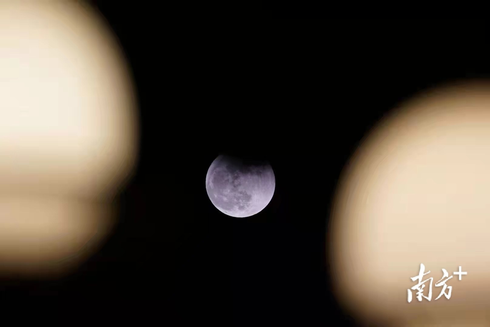11月19日晚6时许,广州上空出现月偏食的天文景象。在天气晴朗的条件下,本次月偏食,在我国绝大部份地区皆可观赏。由于广州今日多云偏阴,月偏食在“食甚-复圆”的环节方可在市区观测到。本次月偏食在北京时间15时18分迎来初亏,17时03分迎来食甚,18时47分迎来复圆,过程历时3小时29分。本次月食也是今年最后一次月食。