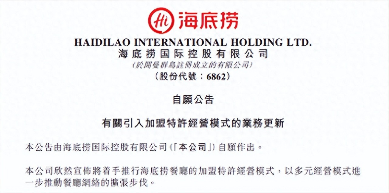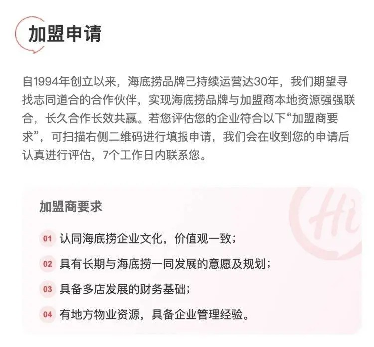 海底捞在今日宣布开放加盟,有意向的加盟商需认同海底捞的企业文化和价值观,具备长期发展的意愿和规划,并且拥有地方物业资源和企业管理经验。