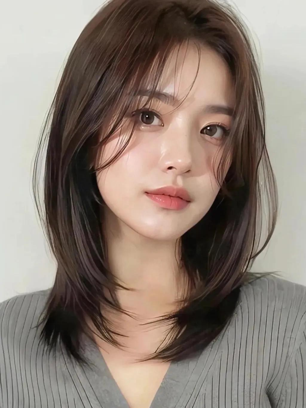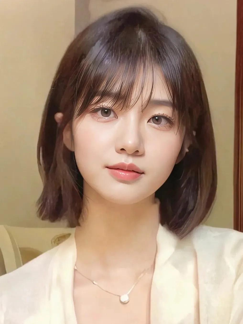 第三款:高层次锁骨发搭配八字刘海!空气刘海减龄、甜美!而八字刘海简约,大气,同时又比较修饰脸型和颧骨。高层次则解决了发量太多和笨重的感觉。在家也很好打理,自然吹干,用夹板夹出一点内扣的弧度即可!