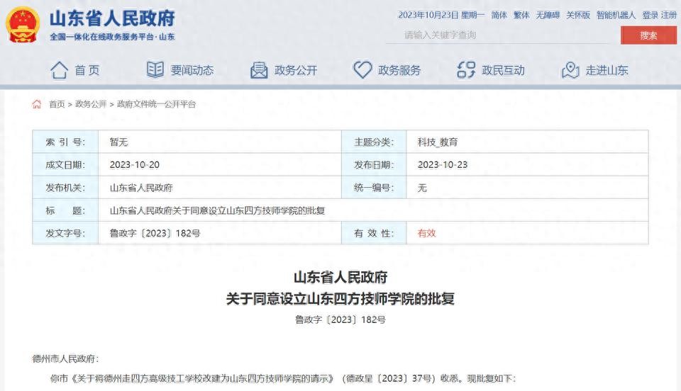 10月23日,山东省政府网站发布《山东省人民政府关于同意设立山东四方技师学院的批复》,同意将德州走四方高级技工学校设立为山东四方技师学院,法人属性为民办非营利性技师学院。