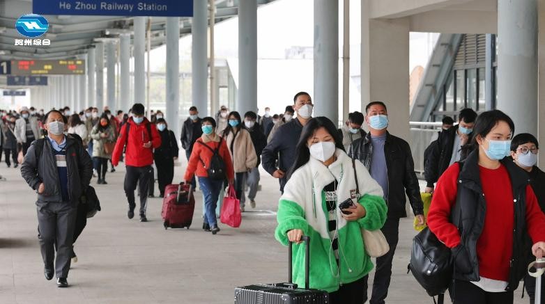 在贺州站,不少旅客拖着行李踏上了回家的路途。大皮箱、编织袋、拉杆车,有扛着的、有推着的、有背着的,各种行李,各种包裹。