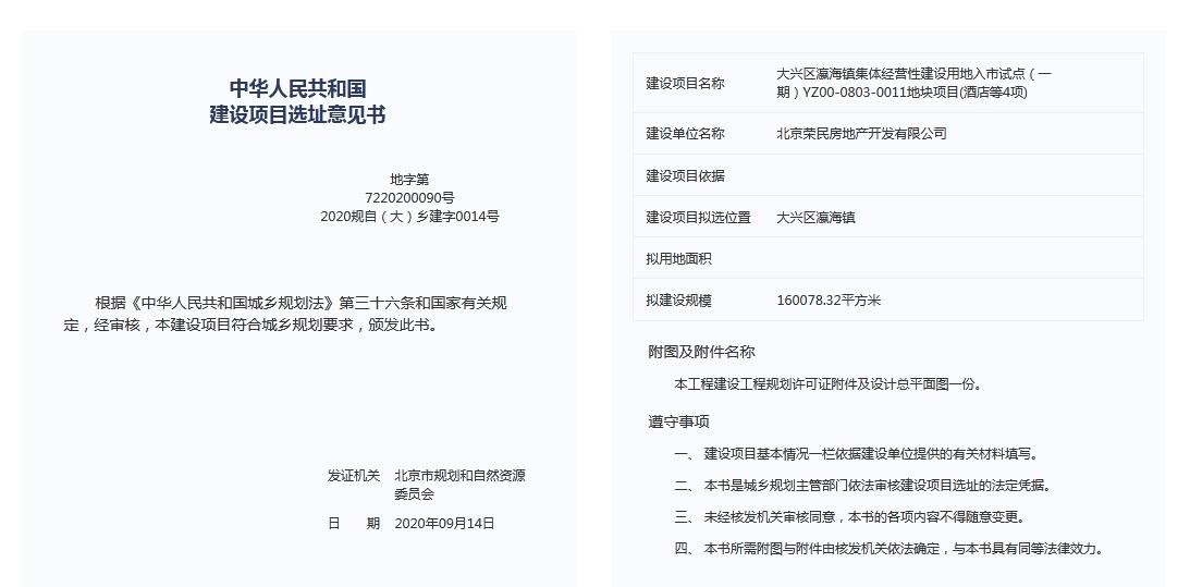 即将于亦庄新城瀛海镇开工建设的五星级酒店有了新进展,最近酒店项目不仅取得了建设项目选址意见书,并且近期项目开发商北京荣民房地产开发有限公司与中建三局北京公司举行了签约仪式,签约仪式中也透露了五星级酒店将命名为北京荣民建国饭店。