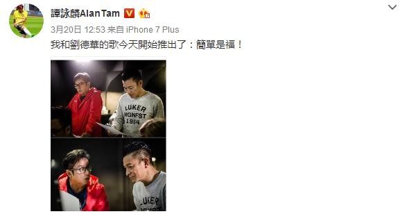 3月20日,谭咏麟就发文推出两人的新歌:“我和刘德华的歌今天开始推出了:简单是福!?”同时晒出合影,应该是很久前两人一起录歌的画面。