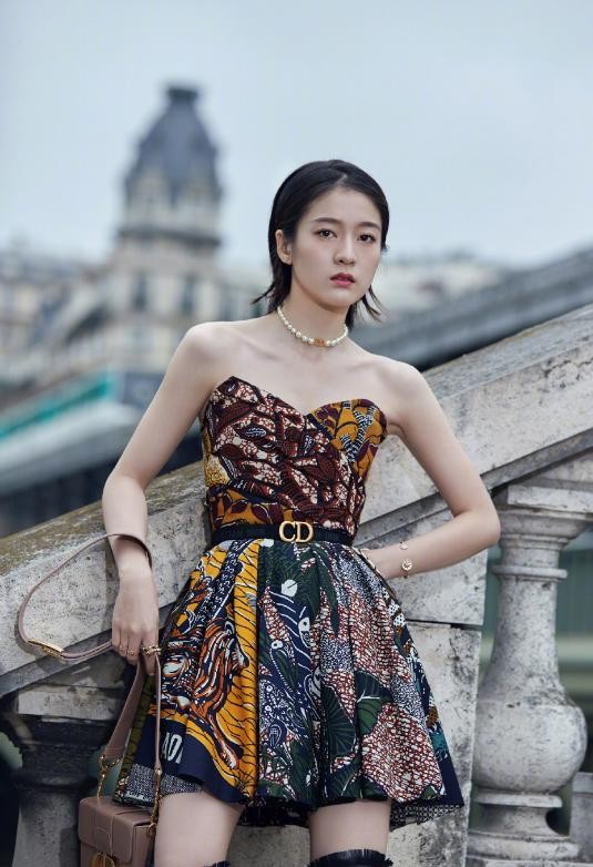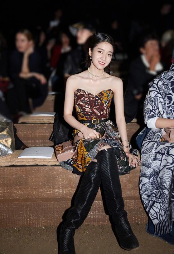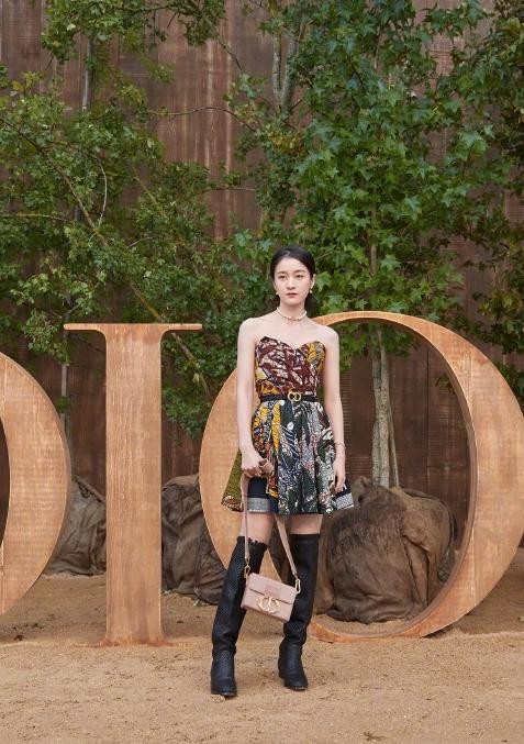 身上这件抹胸裙造型简单,但图案却颇为别致,上半身是深棕色低调,加入黑色、土黄色和渲染白,显得颇为花哨,腰间用简单的黑色腰带装饰,中间是金色的CD字母logo,而下半部分则是百褶设计,黄色绿色拼接,图案也很凌乱花哨,脚上穿着黑色过膝长靴,看着更成熟。