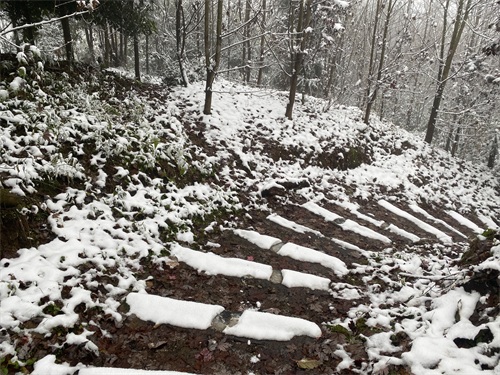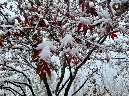 川西红枫岭背靠蓥华山,与红峡谷、钟鼎寺等景点相邻,每到深秋时节,红枫次第变红,形成了一道绝美的风景线。降雪从7日凌晨两点开始,突然的降雪也是给大伙儿献上了难得的美景。