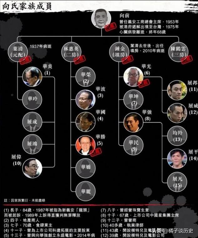 第二位,新义安,它的前身是1866年在万安成立的潮州鹤佬帮。后帮派分裂,后又以“义安工商总会”名义在香港注册,最后又改为今天的新义安,他的大龙头是向前,新义安只奉向氏家族为龙头,下设“五虎”、“十杰”,并在各地区设一位话事坐馆。1980年到1994年警方的几次扫黑行动中发现,新义安成员已涉及到香港各行各业,每年从这里榨取不义之财至少1亿港元。到20世纪八九十年代,“新义安”成员接近10万人。