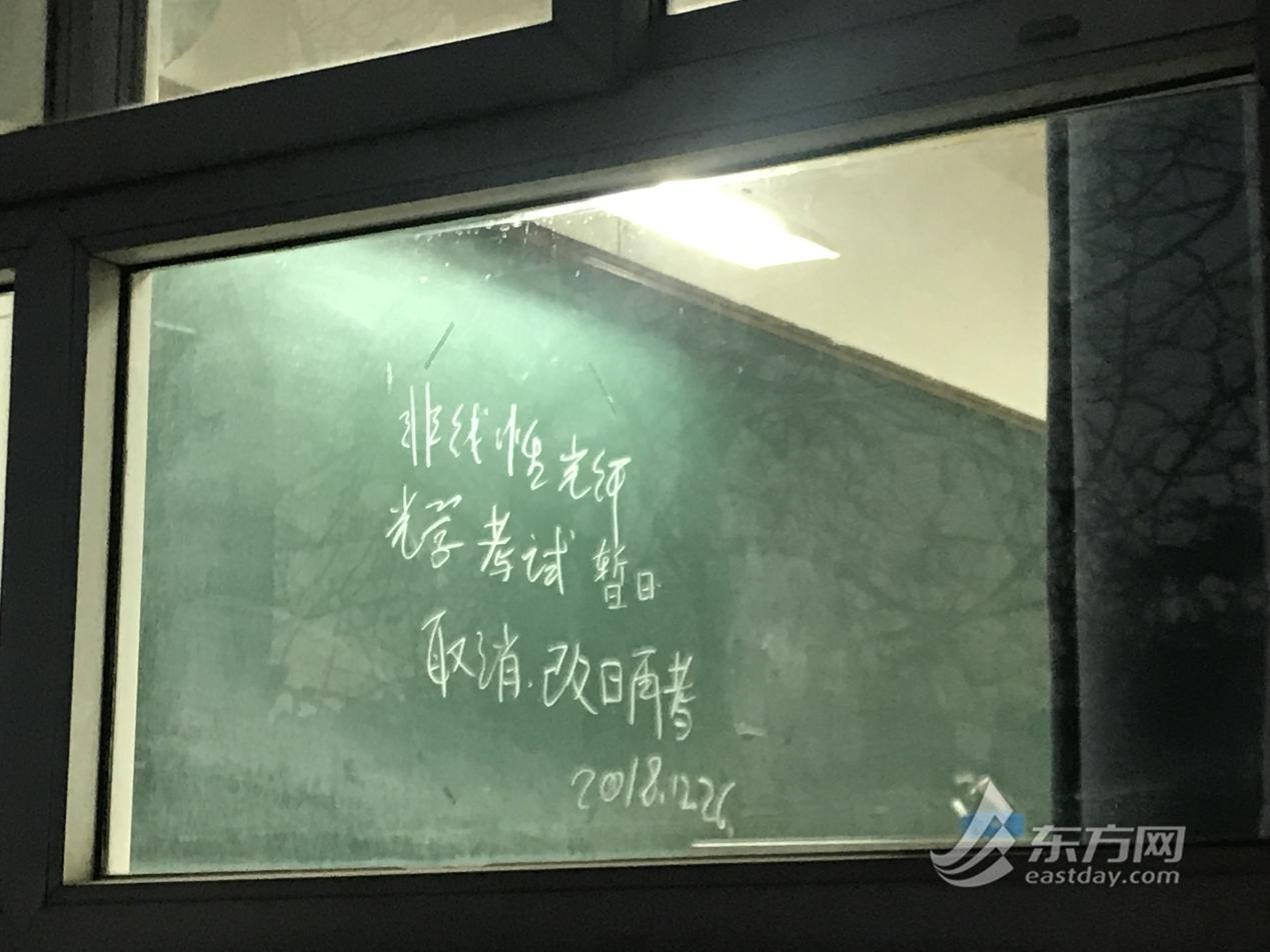 有网友今天上午在微博爆料称,爆炸发生时自己正在教室里考试。记者下午在事故现场发现,2号楼前面的教学楼里,一间教室的黑板上写着“非线性光纤光学考试暂取消,改日再考”,落款的时间是12月26日。