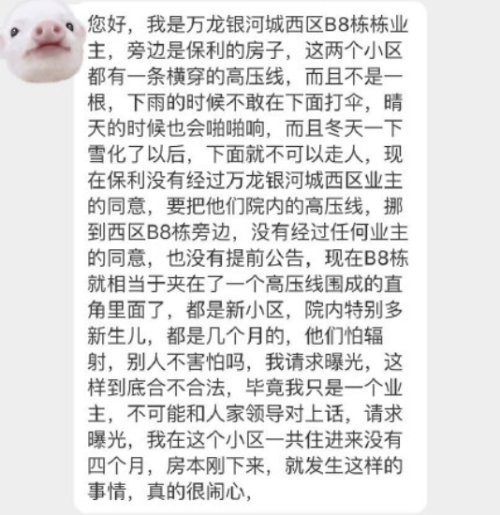 网友:“现在B8栋就相当于夹在了一个高压线围成的直角里面了,房本刚下来,就发生这样的事情,真的很闹心。”