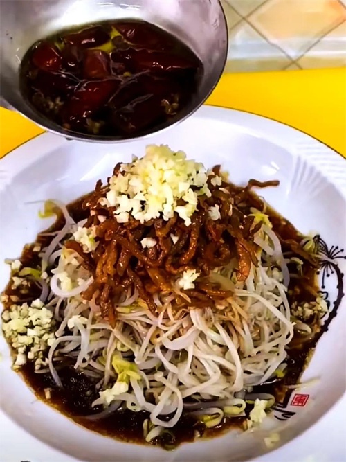 绿豆芽、猪肉丝、金针菇、蒜末、香菜、花椒面、花椒粒、干辣椒、蚝油、生抽、陈醋、鸡精、油