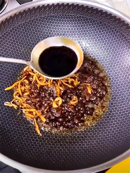 6、另起锅烧油下入肉丝炒香,炒香后下入辣椒面,蚝油,生抽酱油,陈醋,少许鸡精,继续翻炒一会。