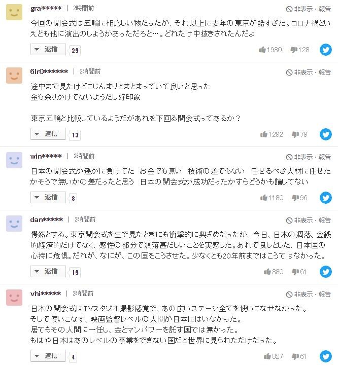 还有网友写道:“北京东奥开幕式让我感觉很愕然,我在现场看了东京奥运会开幕式,也觉得非常震惊和扫兴。今天日本的衰落,不仅仅是金钱、经济上的问题,我们的审美观也严重衰落,我对日本的前景感到担忧。究竟是谁,是什么原因,让这个国家变成了现在这样,至少我们20年前不是这样的。”