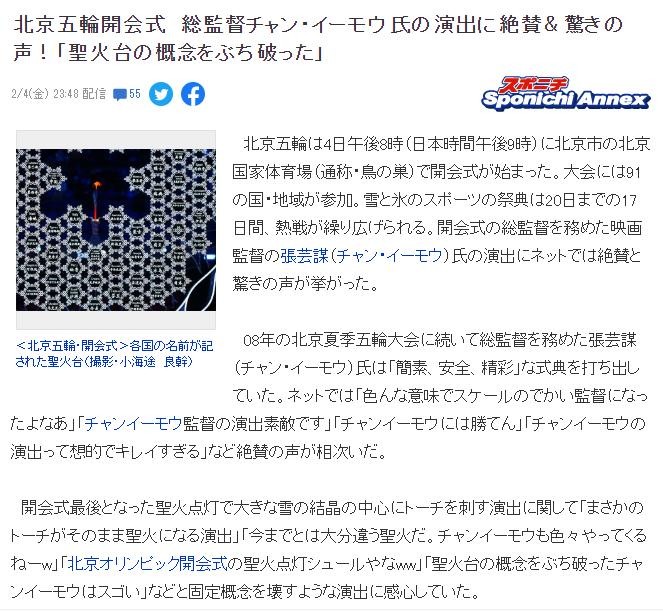 而精彩的北京冬奥会开幕式,也征服了挑剔的日本媒体。不久前,日本的《雅虎体育》就发文,对此次开幕式进行了一番盛赞。日媒表示:“这次北京冬奥会的开幕式由担任过08年北京夏季奥运会总导演的张艺谋操刀,他带给了全球观众一场极致的视听盛宴。无论是在制作还是画面呈现方面,此次开幕式都要比东京奥运会好很多。”