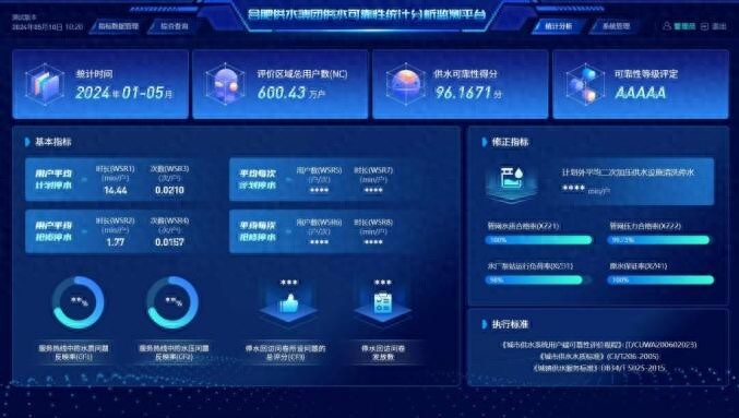依托合肥供水集团大数据中心,打通各平台数据壁垒,研发省内首个供水可靠性统计分析监测平台,推进供水可靠性数字化建设,实现表端停水项、用户反馈项、数据核验项三大类的12项基本指标,计划外平均二次加压供水设施清洗停水时长、政府等相关部门公布的管网水质、水压合格率等5项修正指标数据动态展示,一网统管,全面收集计划停水、抢修停水、水质水压等相关信息,根据既定规则自动分析供水可靠性,实现供水可靠性数字化监测。