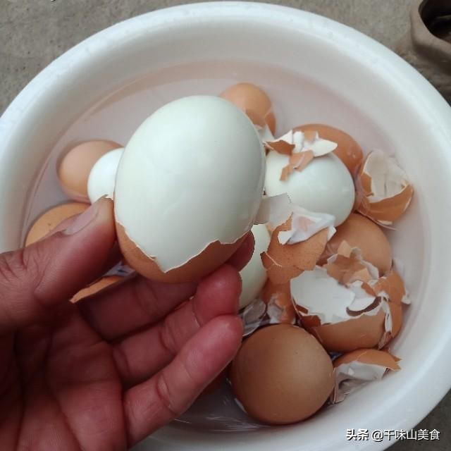 方法②:鸡蛋热的时候去皮,一旦鸡蛋凉了蛋壳里的水就会挥发,失去介质的作用,所以鸡蛋捞出用冷水清洗一下直接去皮,很容易就整个的去掉!