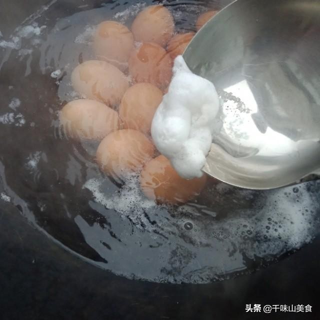 ㈡:开锅后约5分钟左右,用勺子去除表面的杂质,再用勺子背部轻轻敲碎蛋壳,每一个都要敲碎,继续煮!