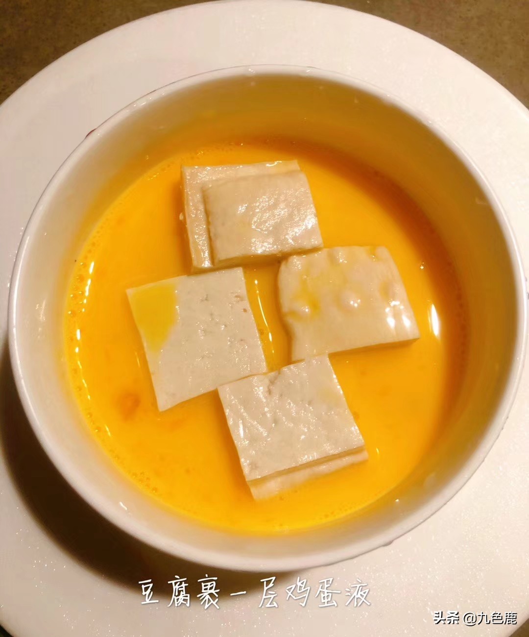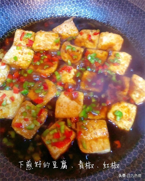 鸡蛋打散,豆腐两面都沾满蛋液,锅里加食用油,放豆腐,记得下锅后不要急着翻面,要不即使是不沾锅也会沾得一塌糊涂,等到一面定型后再翻面,直到两面金黄。豆腐盛出来,锅内加入少许酱油,料酒、水调汁煮沸。