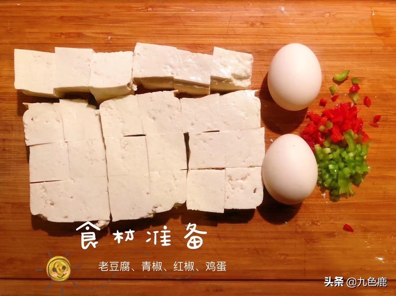 豆腐切块,入淡盐水中焯水捞出沥干水分备用,准备两个鸡蛋,胡萝卜,青椒,姜蒜切碎备用