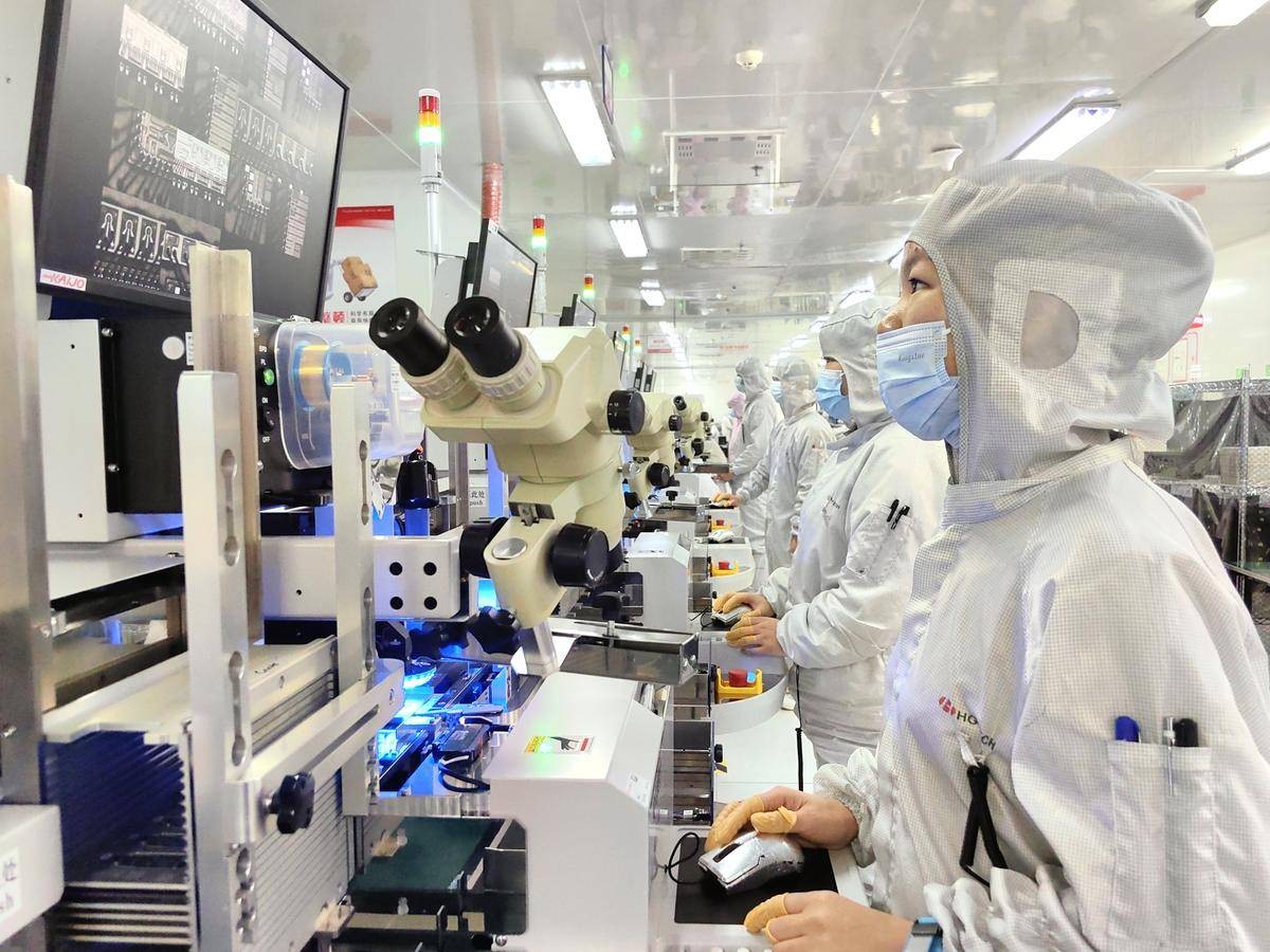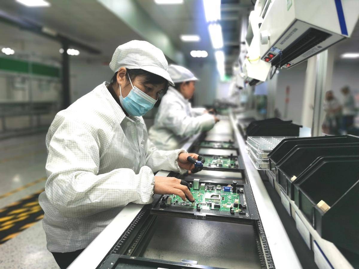 2月18日,工人们安装主板上的零部件。(湖北日报全媒记者 林晶 摄)