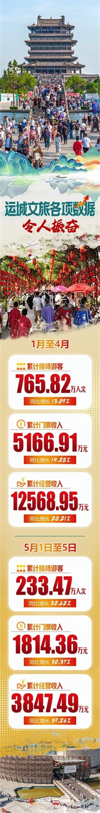 各项数据令人振奋。据统计,今年5月1日至5日,全市开放的51家A级景区、岚山根·运城印象及旅游度假区累计接待游客233.47万人次,同比增长32.62%;累计门票收入1814.36万元,同比增长30.37%;累计经营收入3847.49万元,同比增长39.26%。
