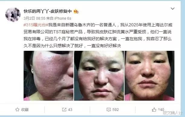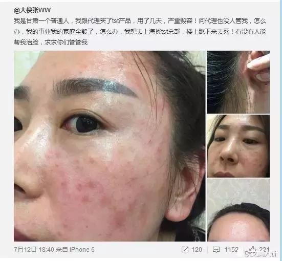 因为在今年年初开始,张庭的自营品牌就被爆出产品无备案,且造成使用产品的女生出现毁容事件。轰动最大的,就是微博上一名叫做“快乐的周丫丫”的菇凉,因为自己代理TST活酵母,同时也在用,但是一段时间后,脸上出现了各种不适症状,此时,张庭公司给出的解释是在排毒,呵呵哒,脸上被激素侵蚀的不像话了,竟然说是排毒现象。这种作为令人作呕。