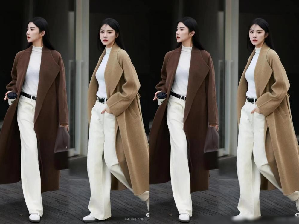 在搭配时,可以将外套和其他下身单品选择同样颜色,形成上下部位一致的颜色,这样更显得让人有高级感,不会显得土里土气。