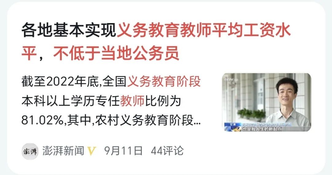 自2023年起,相关部门也反复强调,义务教育阶段人民教师的工资待遇应确保不低于当地公务员或国有企业在职员工的平均水平。