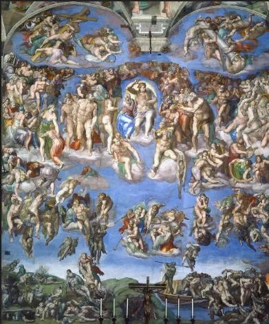 《最后的审判》则是米开朗基罗晚年的杰作,这幅壁画位于西斯廷教堂祭坛后的墙壁上,面积达 600 平方米。画面描绘了世界末日时,耶稣基督降临审判世人的场景。画面上的人物众多,姿态各异,有的在忏悔,有的在恐惧,有的在绝望中挣扎,还有的在期待救赎。米开朗基罗用强烈的色彩对比和夸张的人物形象,营造出一种震撼人心的氛围。耶稣基督居于画面中心,面容威严,双臂张开,仿佛掌控着世间的一切。在他的周围,圣徒们各司其职,有的在吹响号角,有的在记录着审判的结果。整个画面充满了动感与张力,让人仿佛置身于末日审判的现场,感受到了人类在面对终极审判时的复杂情感。
