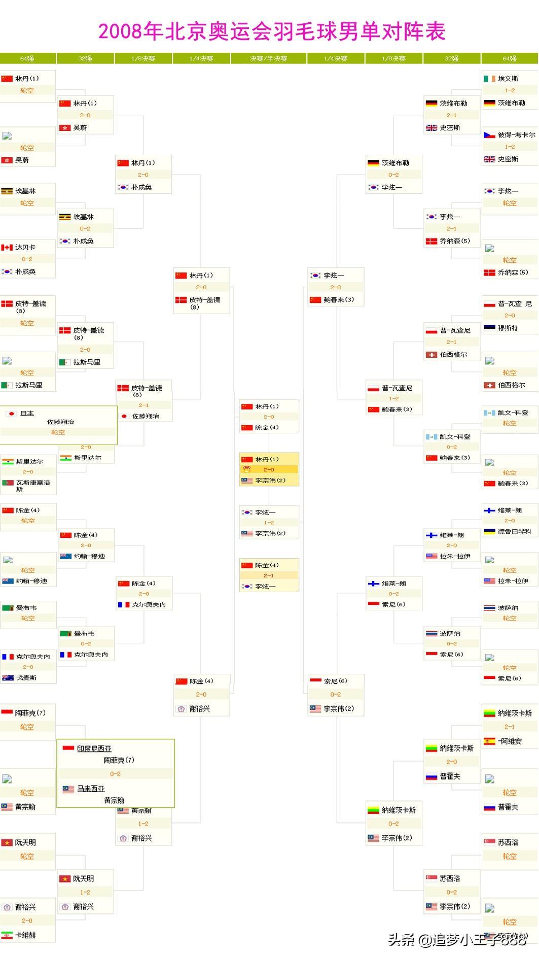 咱们先看看北京奥运会决赛前两人是如何晋级及晋级对手,对比下进程的难易程度,好分析出两人决赛前的比赛状态。