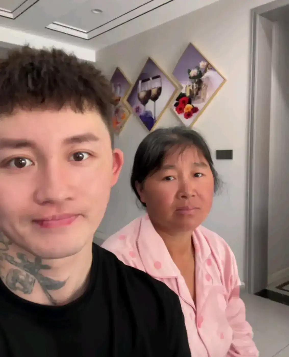在合影中,大飞强颜欢笑着,并且抱着妈妈的肩膀,而母亲却面露苦涩,并且没有挽住儿子腰间,而是僵硬地抱着儿子的手臂。