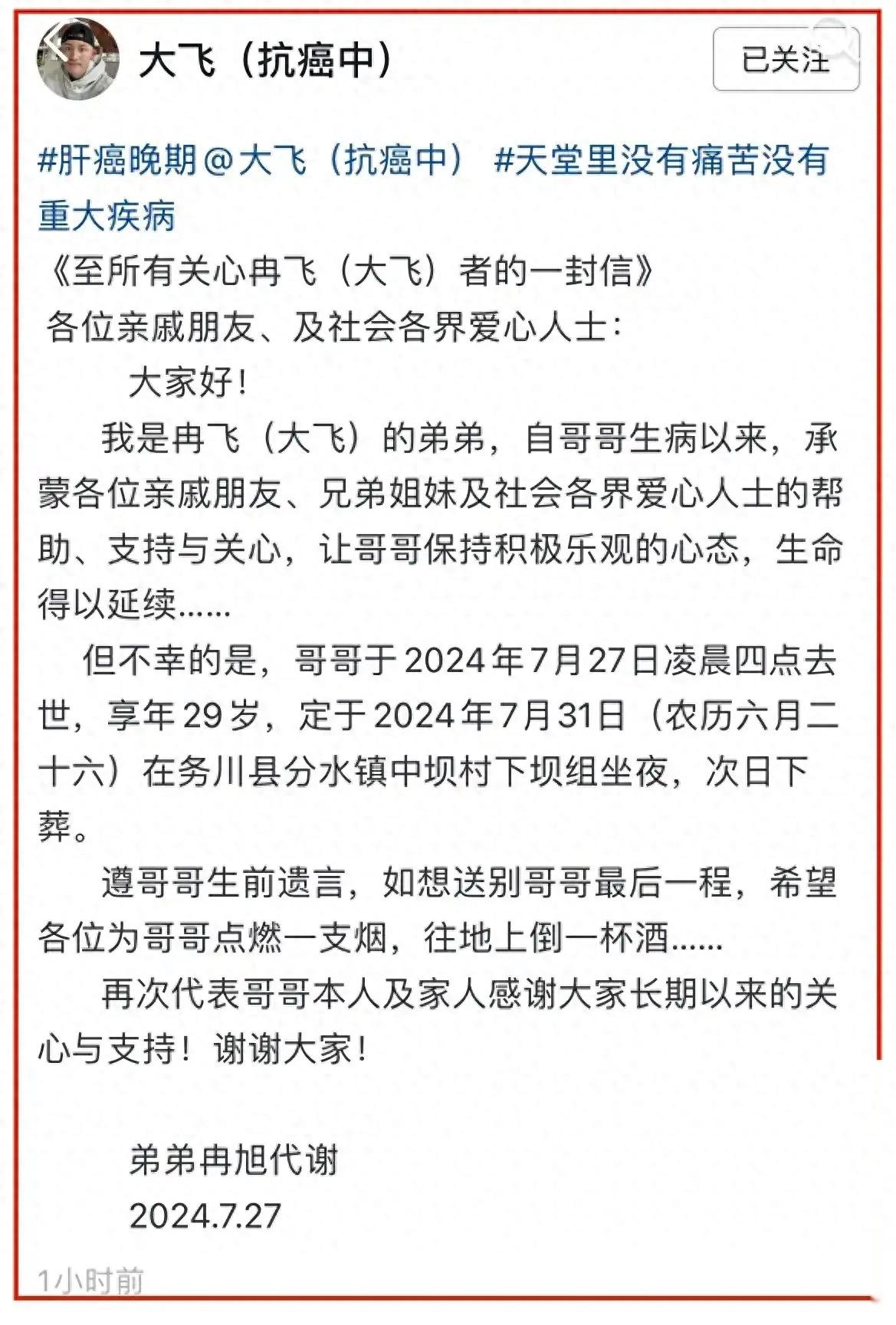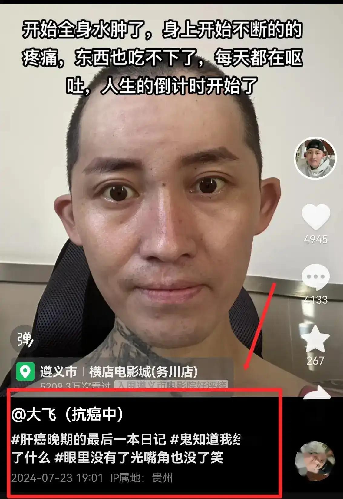就在4天前,大飞还在网上发文称自己身体正经历着非人折磨,人生已经进入倒计时,并且眼睛已经有蜡黄迹象了。