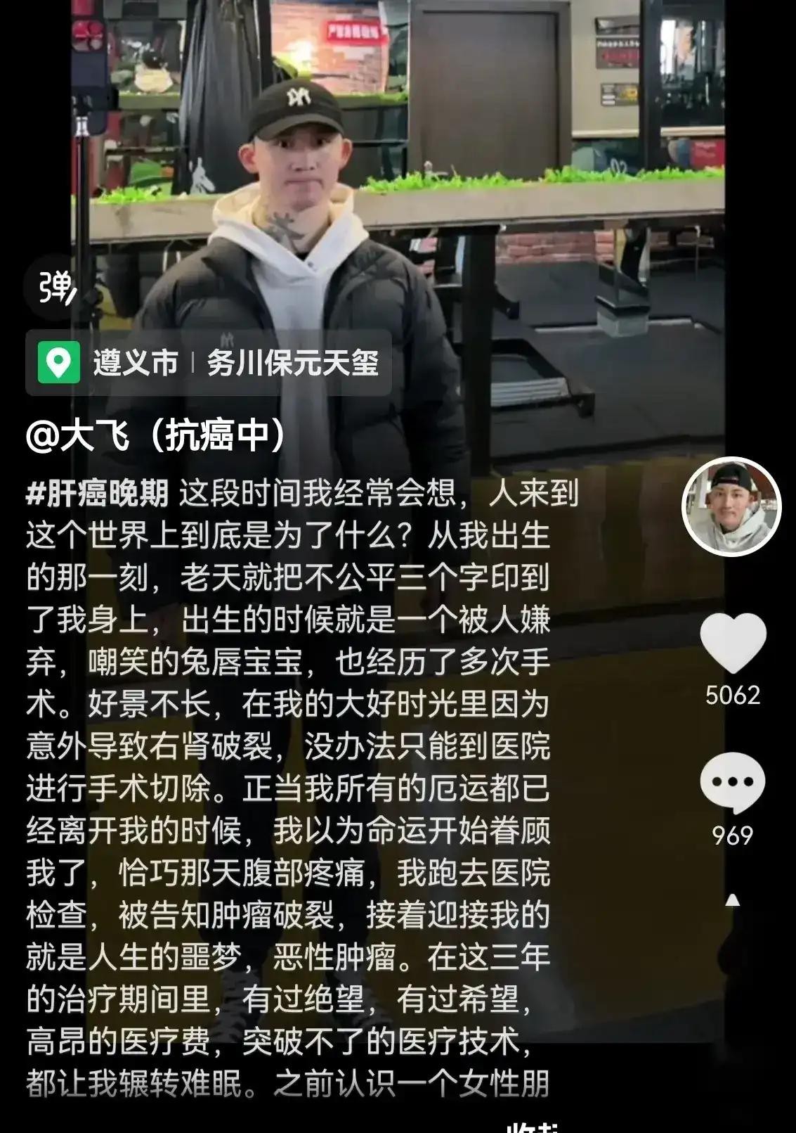 这是一个让人深感心酸的故事,29岁的大飞,在抗击肝癌的过程中,最终也是以失败告终,大飞是来自贵州的抗癌网红,他热爱健身,抗癌的过程中,他尽管精力不济,但依然坚持着健身,试图以此来抗击肝癌。