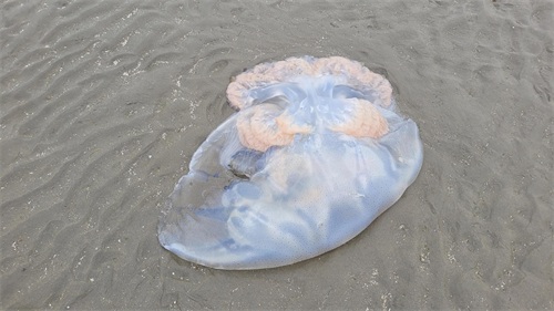 据说这边看日落很美,我们去的时候,大风,下雨,退大潮,一沙滩都是超大水母,捡了几只螃蟹