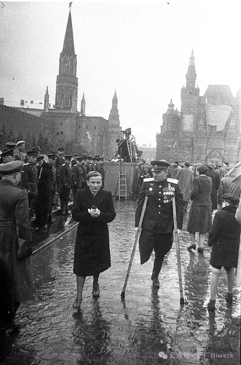 独腿将军亚历山大·格拉德科夫和妻子一同参加莫斯科胜利阅兵式,他在奥德河前线失去了右腿。
