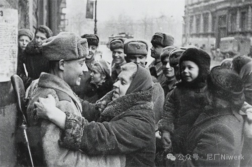 解除封锁后,列宁格勒市民热烈欢迎参加解围的苏军指战员。