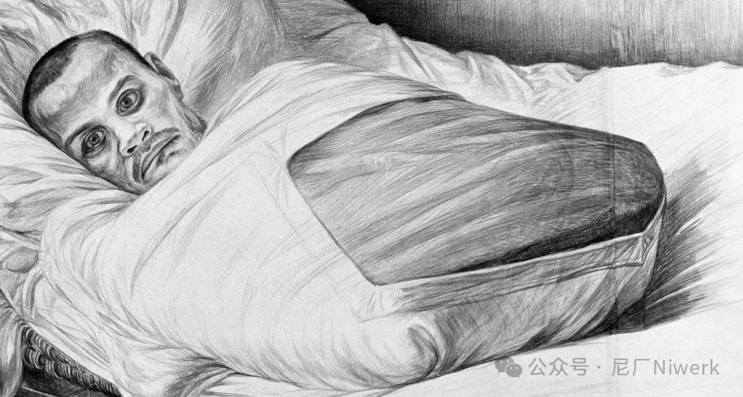 艺术家根纳季·多布罗夫的画作,一位失去四肢和语言能力的伤残老兵。