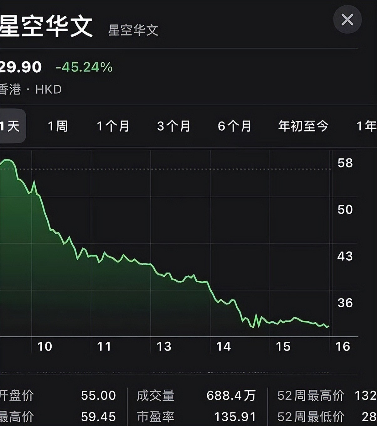 截至目前,好声音母公司星空华文的股价表现令人瞠目结舌,单日跌幅高达45%,股价从54.6港元跳水至29.9港元,累计跌幅近80%,总市值遭受近350亿港元的蒸发。这样的市值缩水不仅令投资者们痛苦,更是将好声音的前景蒙上了一层阴影。