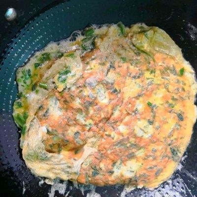 4、热锅烧油,倒入鸡蛋液,小火煎至金黄,翻面煎另一面~