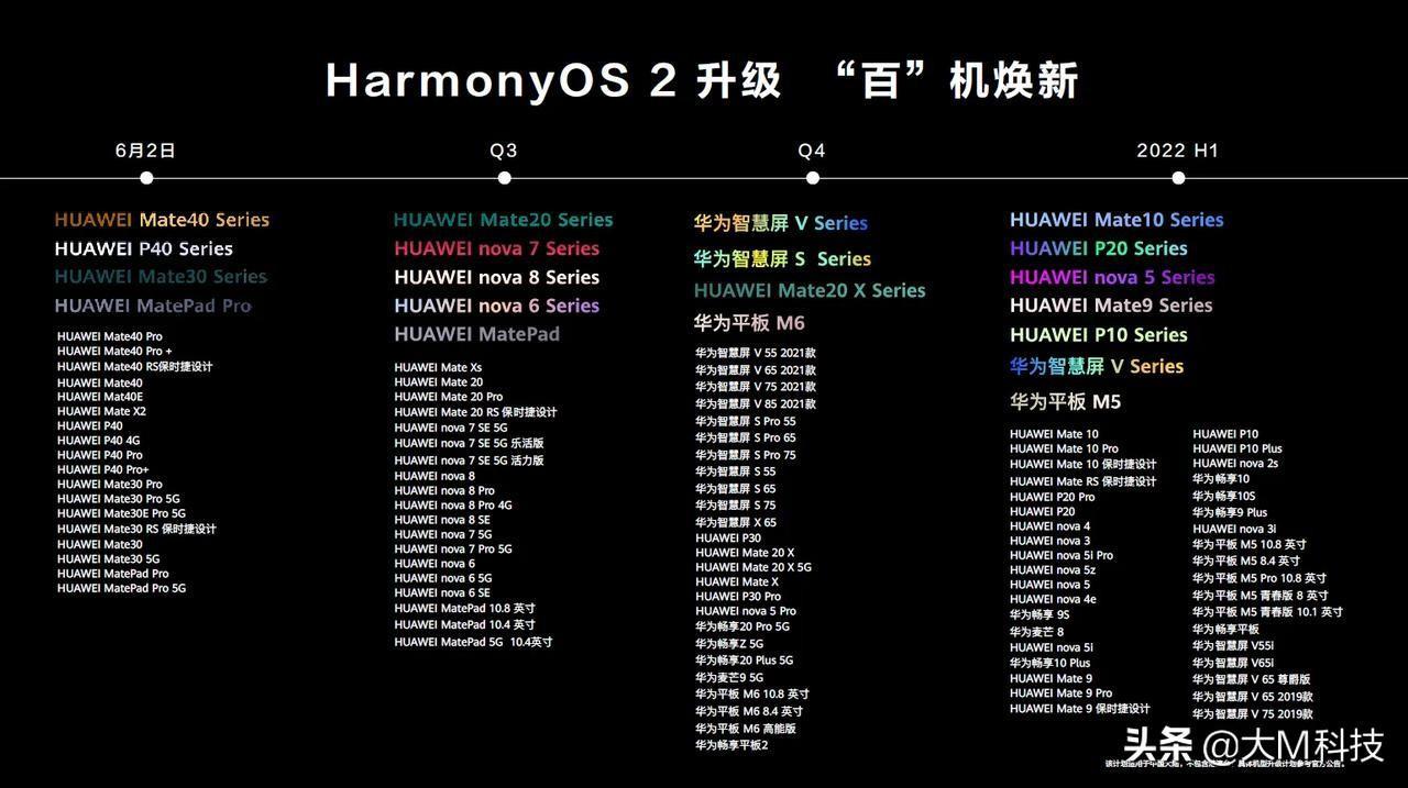 昨晚,HarmonyOS 2及华为全场景新品发布会之后,很多人都在讨论“鸿蒙发布是否能打破美国的垄断”。这一讨论我觉得华为秉持开放与国内厂家互相合作,这一目标是很有机会实现的。而且在发布会上正式官方宣布了近百款支持升级的机型,可见对鸿蒙的用心以及花了多大力气。知道你们心急的,我们先看支持升级机型图: